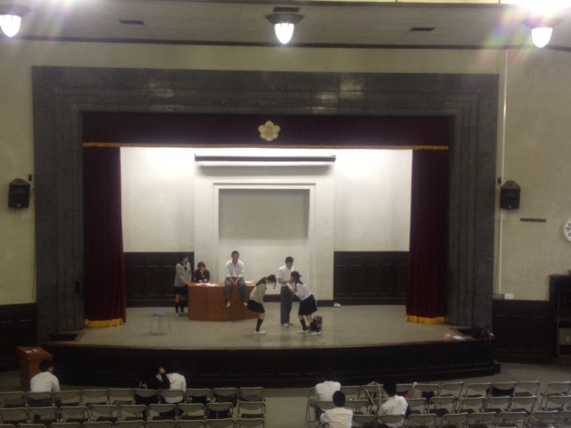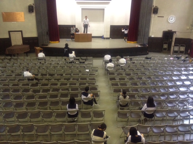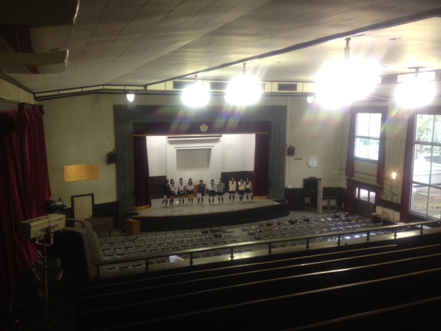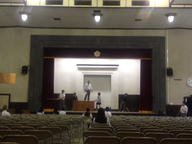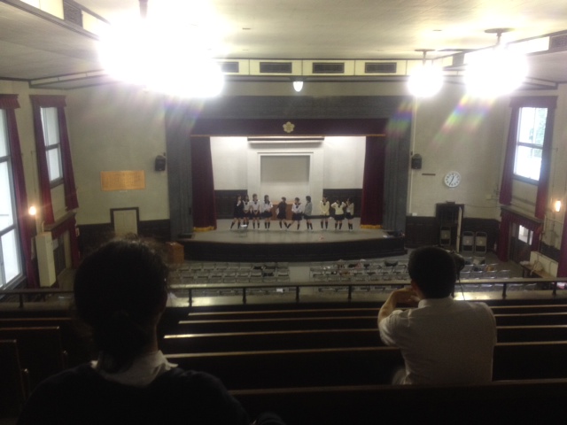 一方が声を出しているとき、もう一方は講堂の反対側に立って、聞こえ具合などをチェックします。